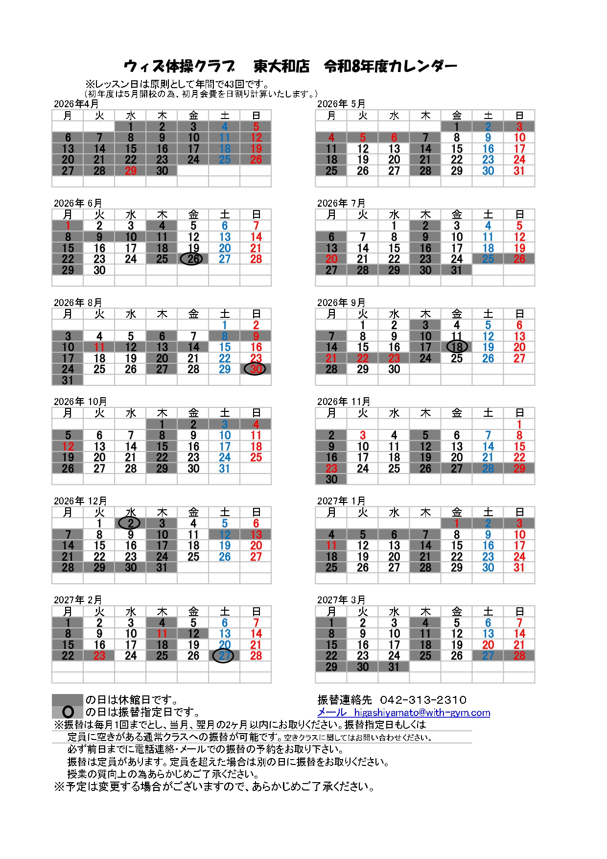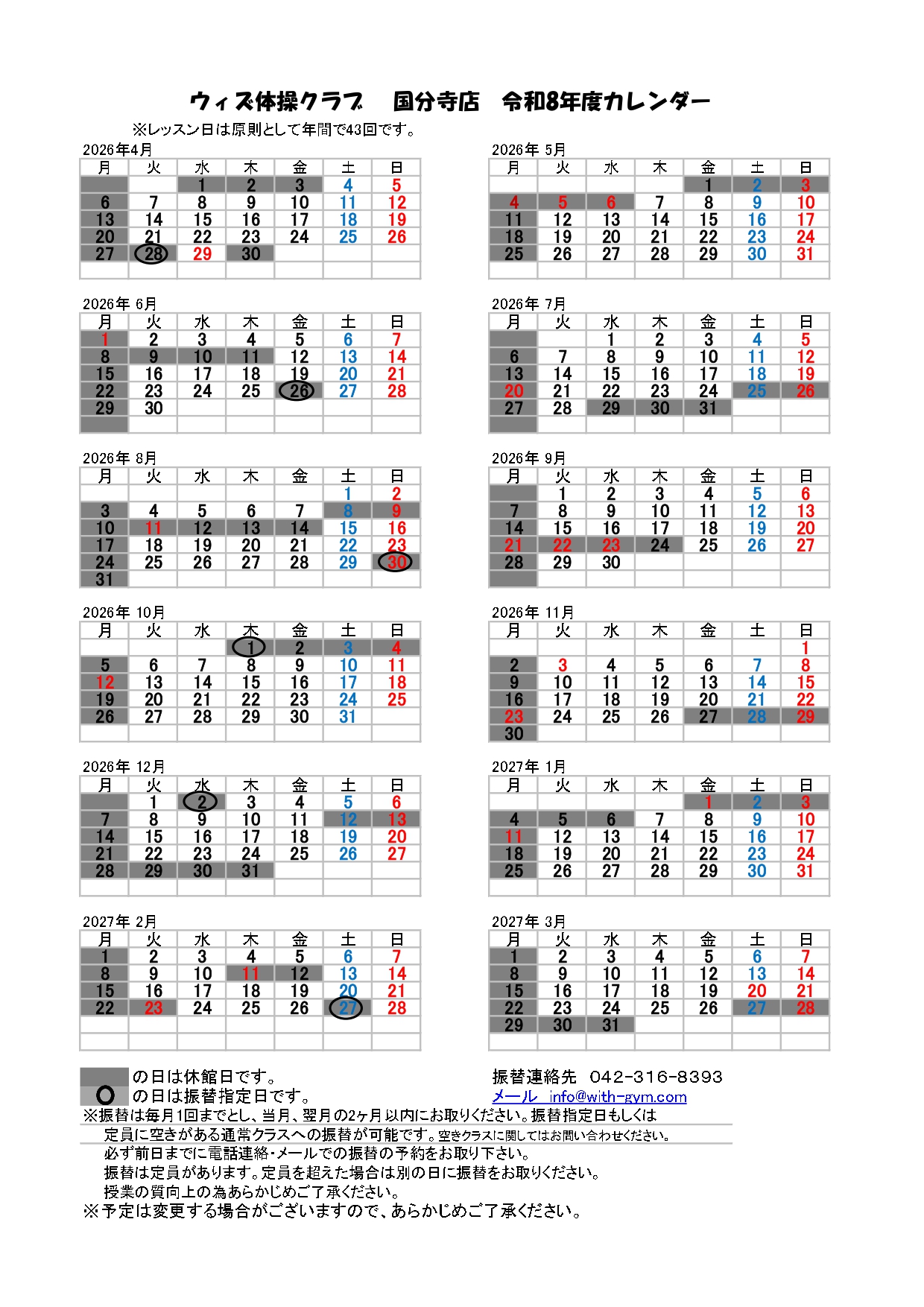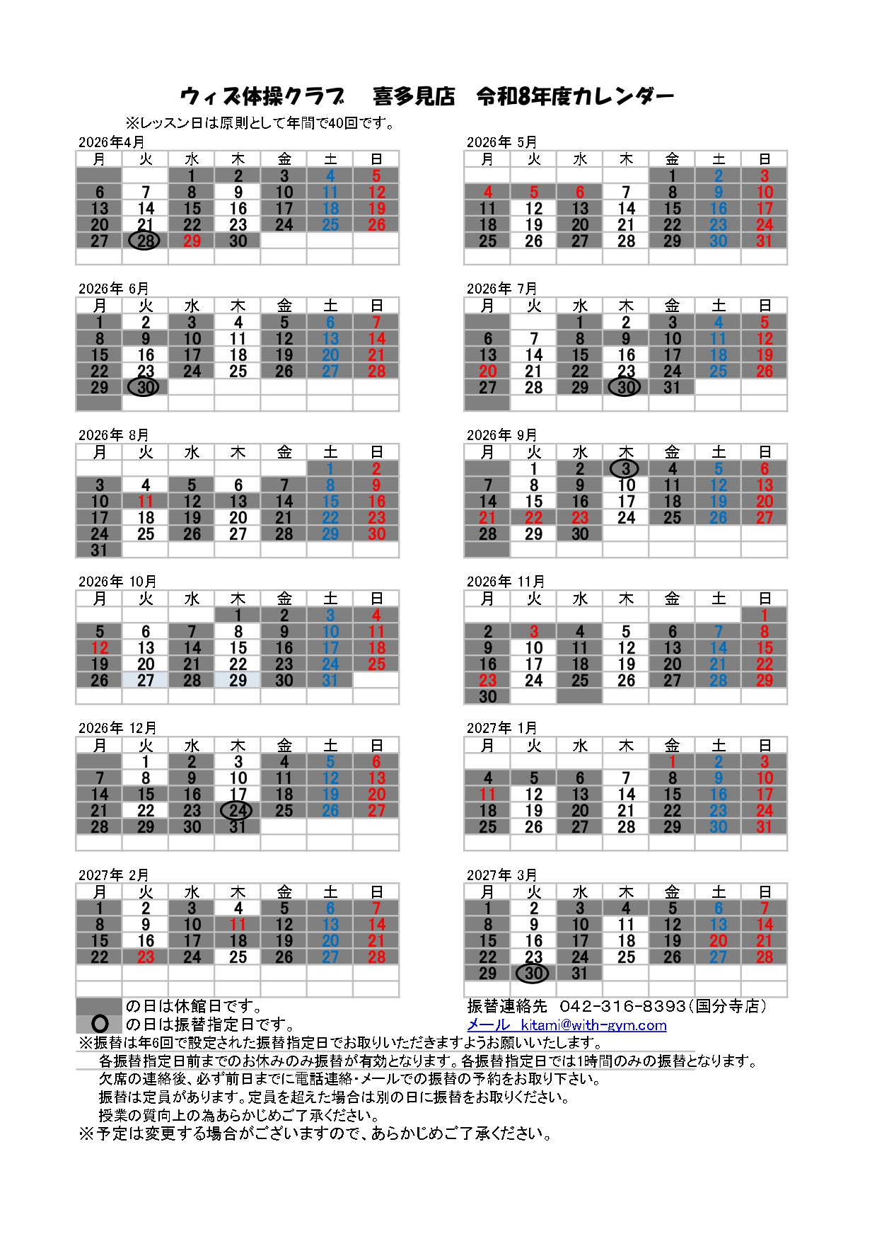 前年度の各店舗のカレンダーは